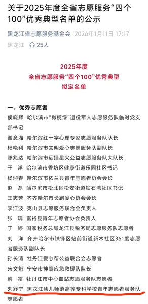 近日,黑龙江省志愿服务基金会公示2025年度全省志愿服务“四个100”优秀典型名单,我校外语系刘舒宁同志成...